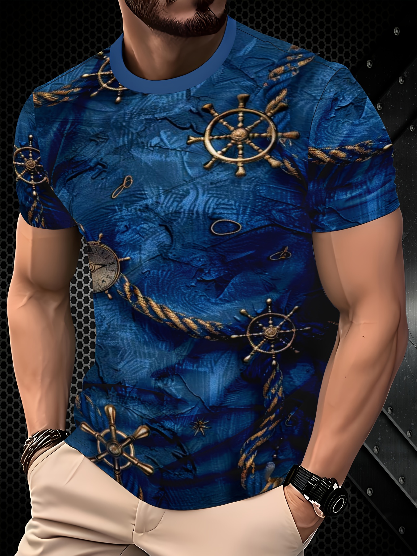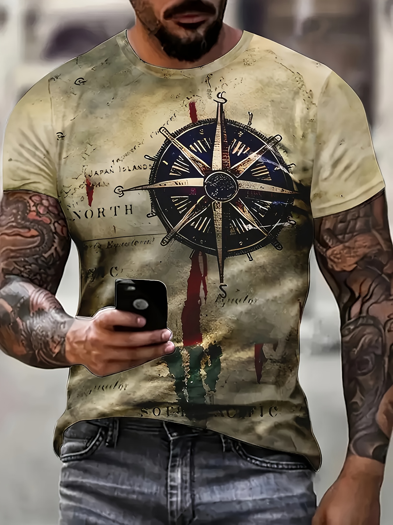 Camiseta Masculina com Estampa 3D de Bússola e Mapa Mundi – 100% Poliéster Elástico, Corte Regular para Verão, Lavável na Máquina, Tecido Confortável, Design Moderno, Leve e Flexível, Moda Juvenil
