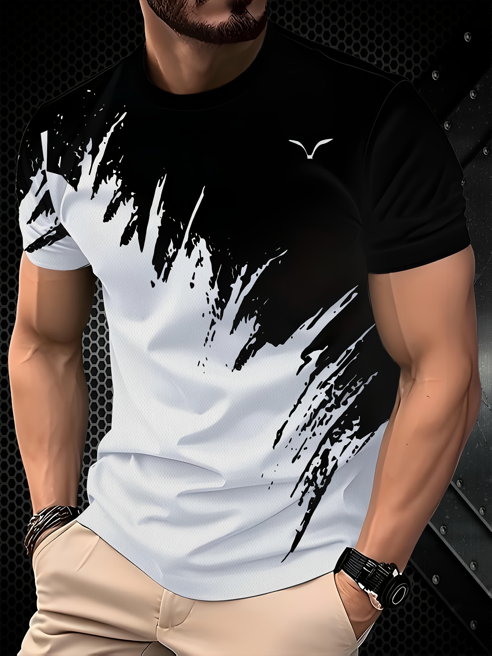 Camiseta Masculina Casual de Manga Curta com Estampa 3D de Gaivota – Design em Contraste Preto e Branco, Poliéster Respirável, Lavável na Máquina, Corte Regular para Atividades ao Ar Livre no Verão & Uso Casual, Camiseta Suave para Férias