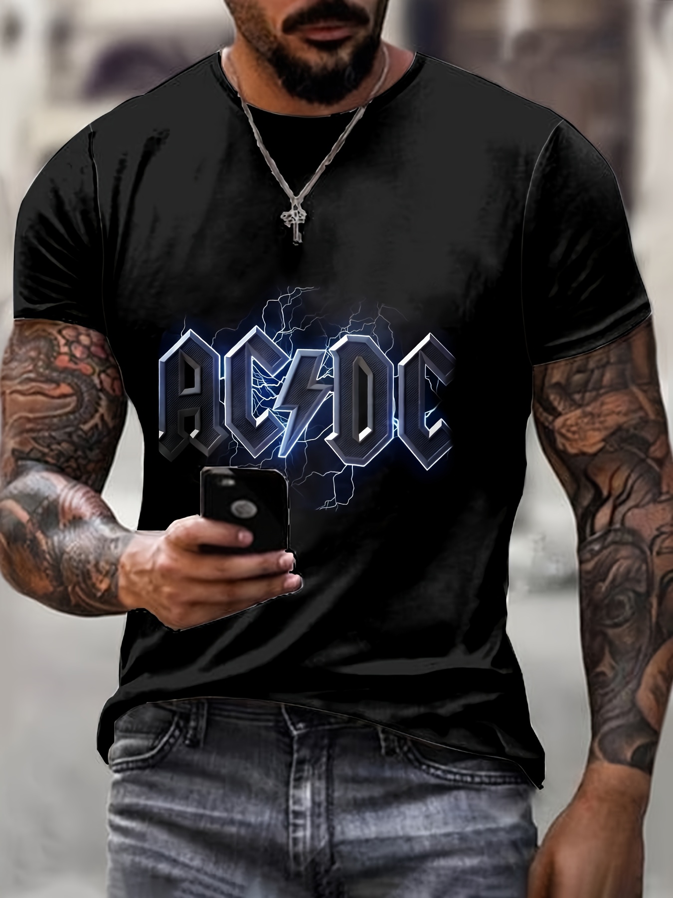 Camiseta Masculina de Manga Curta e Secagem Rápida com Gráfico de Raio AC/DC – Camiseta Preta Casual de Verão para Vestuário Casual & Atividades ao Ar Livre, Roupa para Fãs de Música | Camiseta Estampada | Textura Lisa
