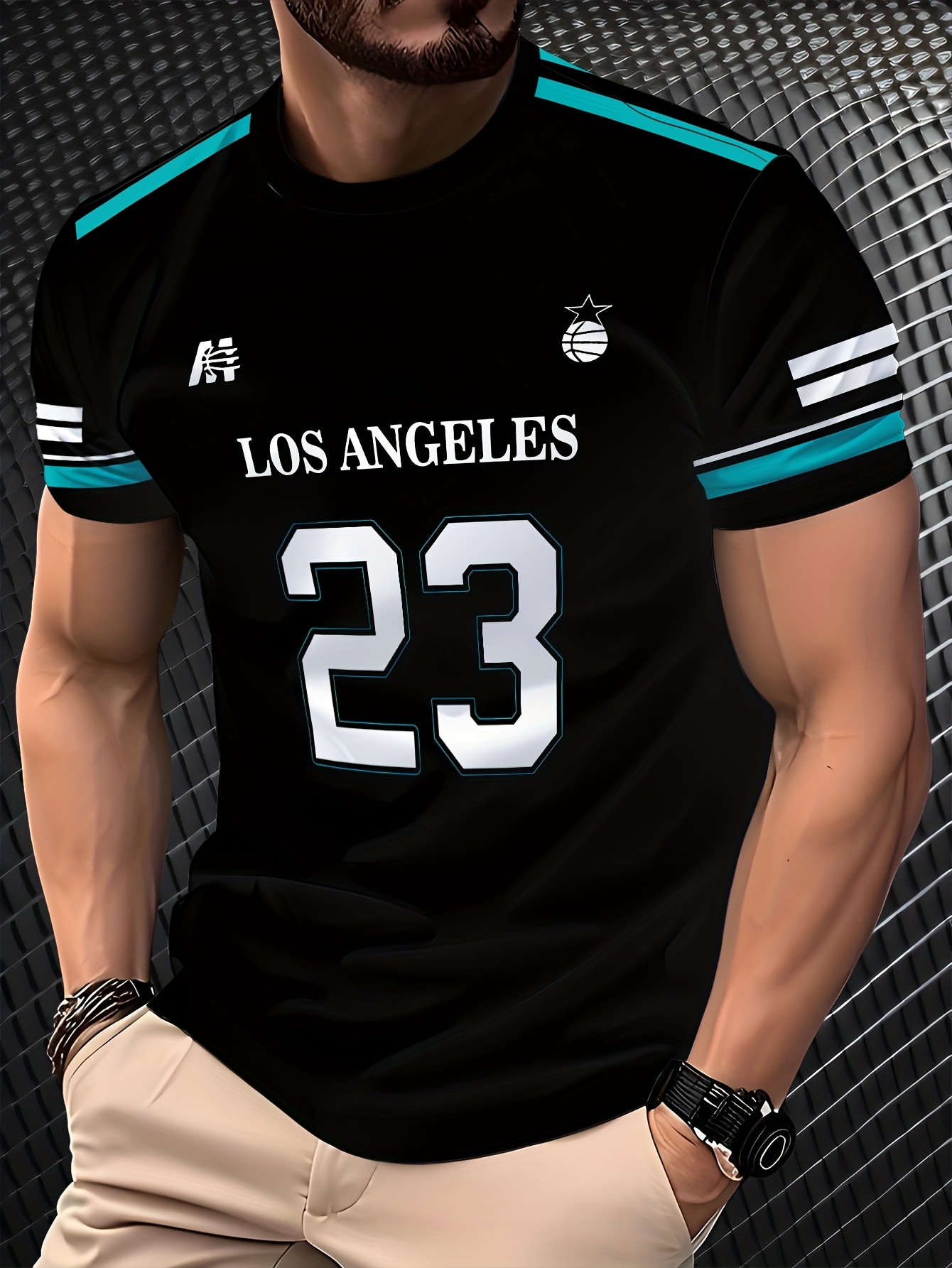 Camiseta Masculina com Estampa Digital 3D de Los Angeles, Gola Redonda Respirável com “Los Angeles” e Desenho “58.42cm”, Tecido Leve de Poliéster, Branco com Listras Verdes, Uso Casual em Todas as Estações, Vestuário para Todas as Estações | Camiseta de Moda Urbana | Camiseta de Poliéster