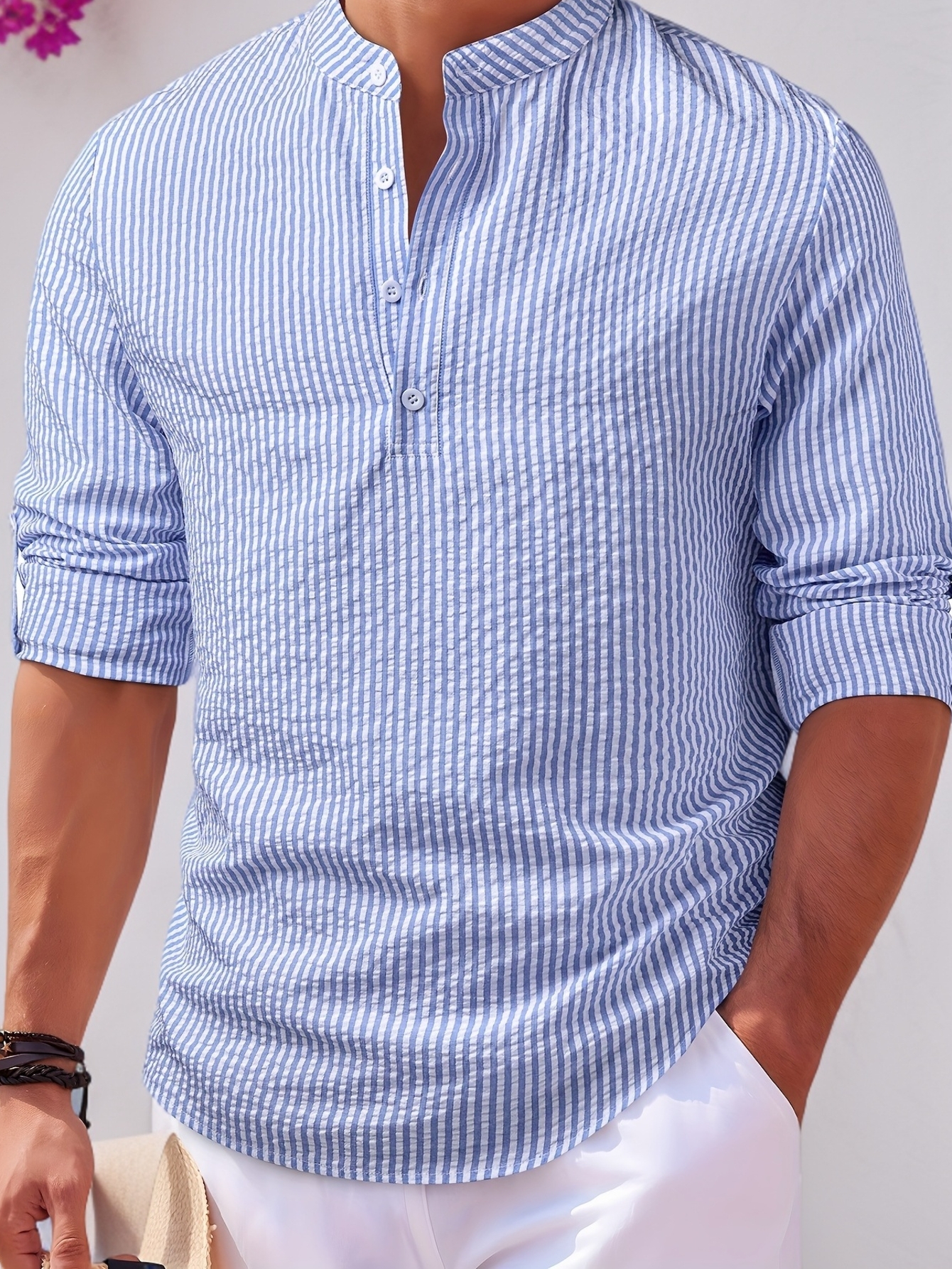 Camisa Henley Masculina com Estampa Aleatória Texturizada, Listras Azuis e Brancos em Punho Aberto de Gola Alta