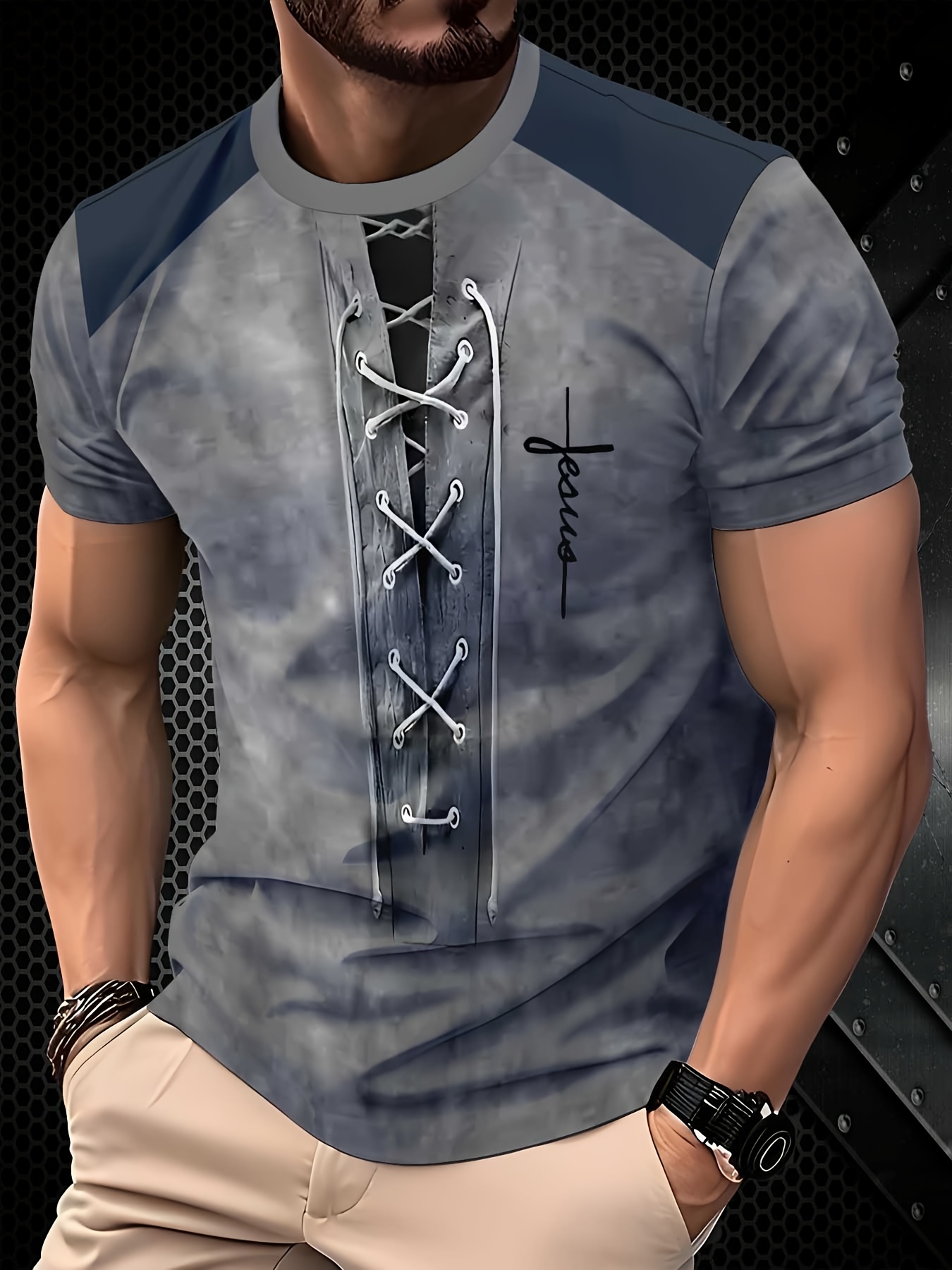 T-shirt casual de verão para homem – Estampa cinza com cordão de imitação impressa em 3D, poliéster respirável, lavável à máquina, ajuste regular, manga curta, decote redondo para desporto e vestuário casual, tecido confortável