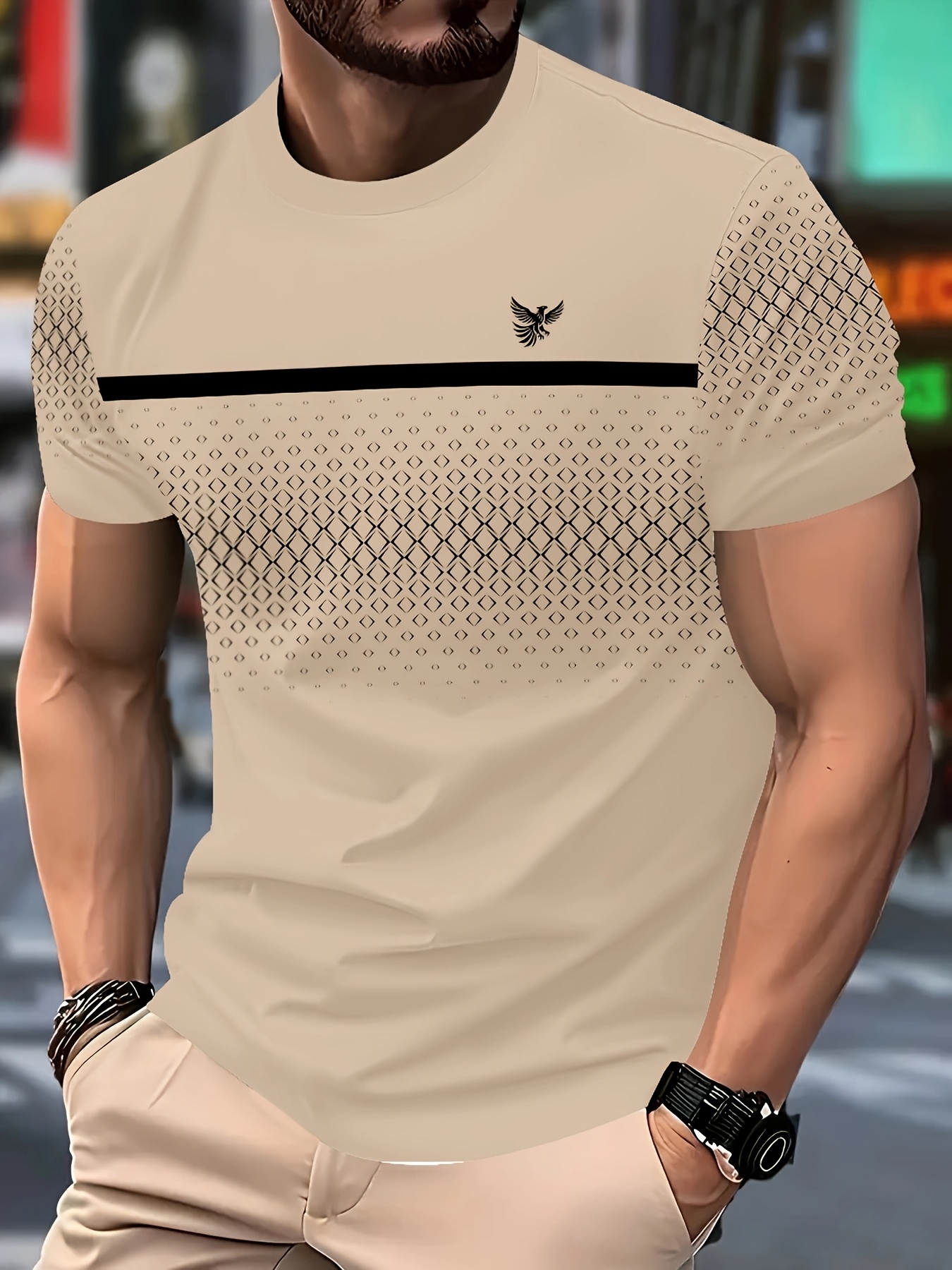 T-shirt clássica para homem em estilo parisiense bege – Manga curta, corte solto, design com logotipo de pássaro listrado preto, decote redondo, 100% poliéster, lavável à máquina – Top de moda verão elegante