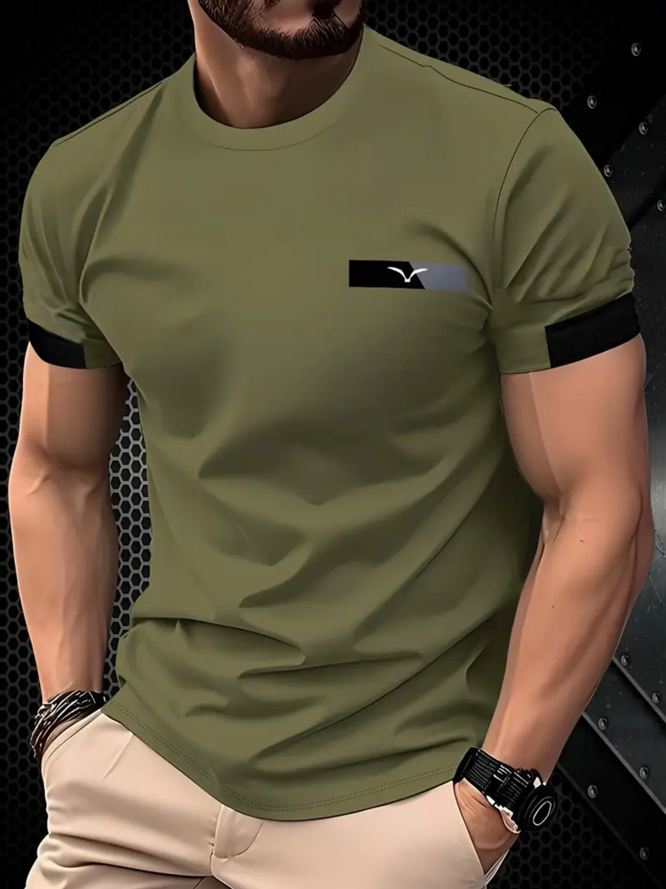 T-shirt casual de verão para homem – Decote redondo respirável, manga curta com detalhe listrado e estampa de pássaro, verde oliva, leve e confortável para atitudes casuais, roupa confortável | Camisa de decote redondo | Tecido elástico