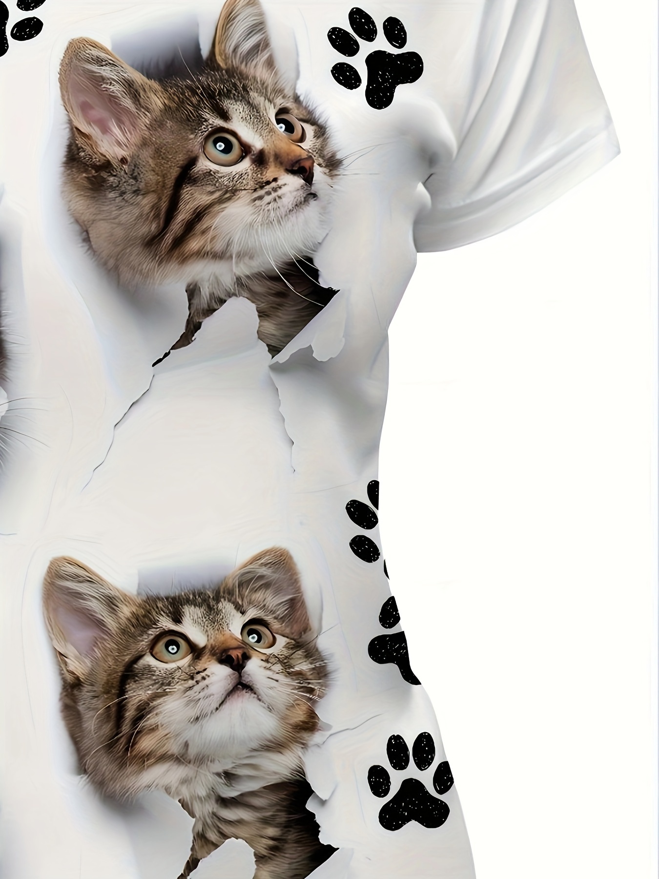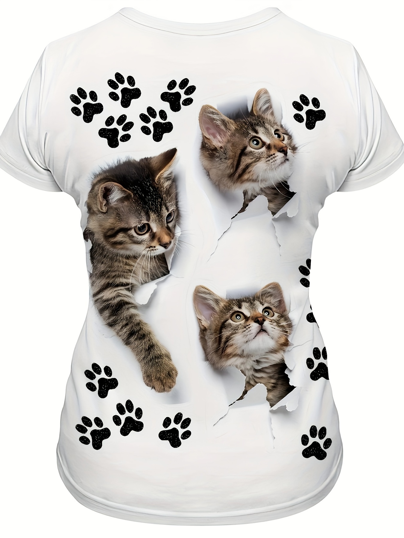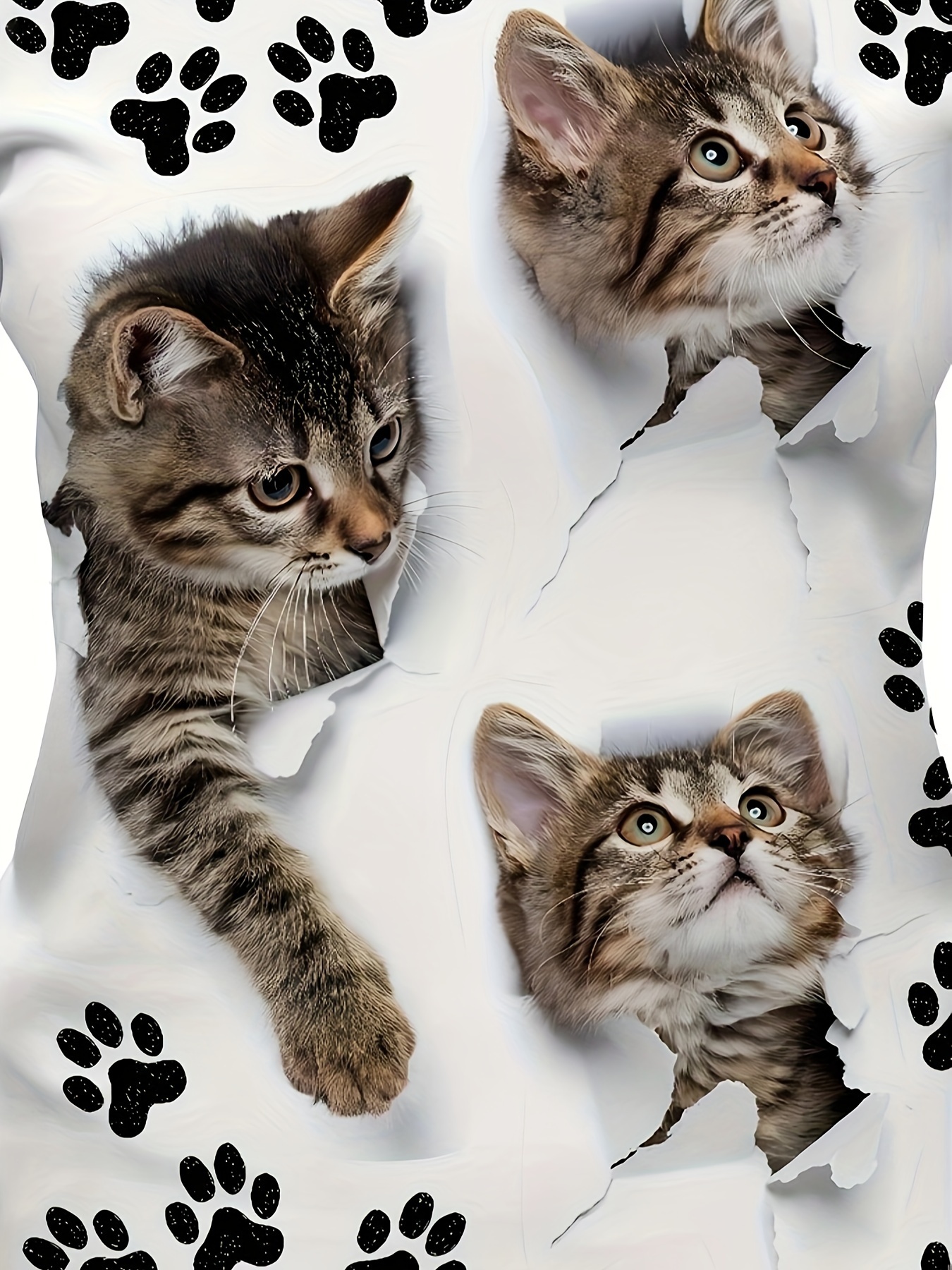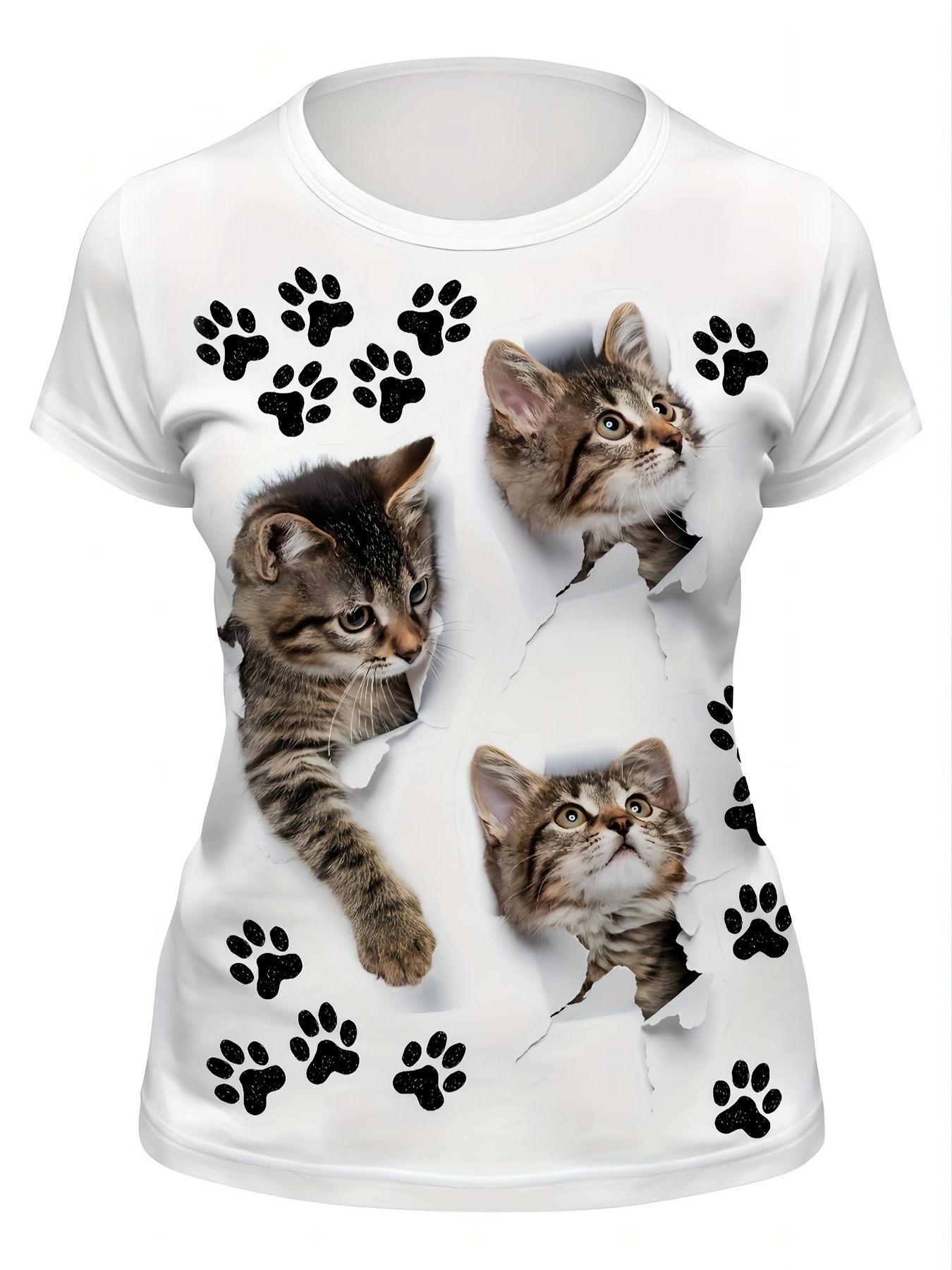 1pc WhimsyCat Camiseta Feminina Casual de Poliéster com Desenho de Gato 3D e Impressão de Pata, Gola Redonda, Tecido de Malha Levemente Elástico, Conforto para Todas as Estações