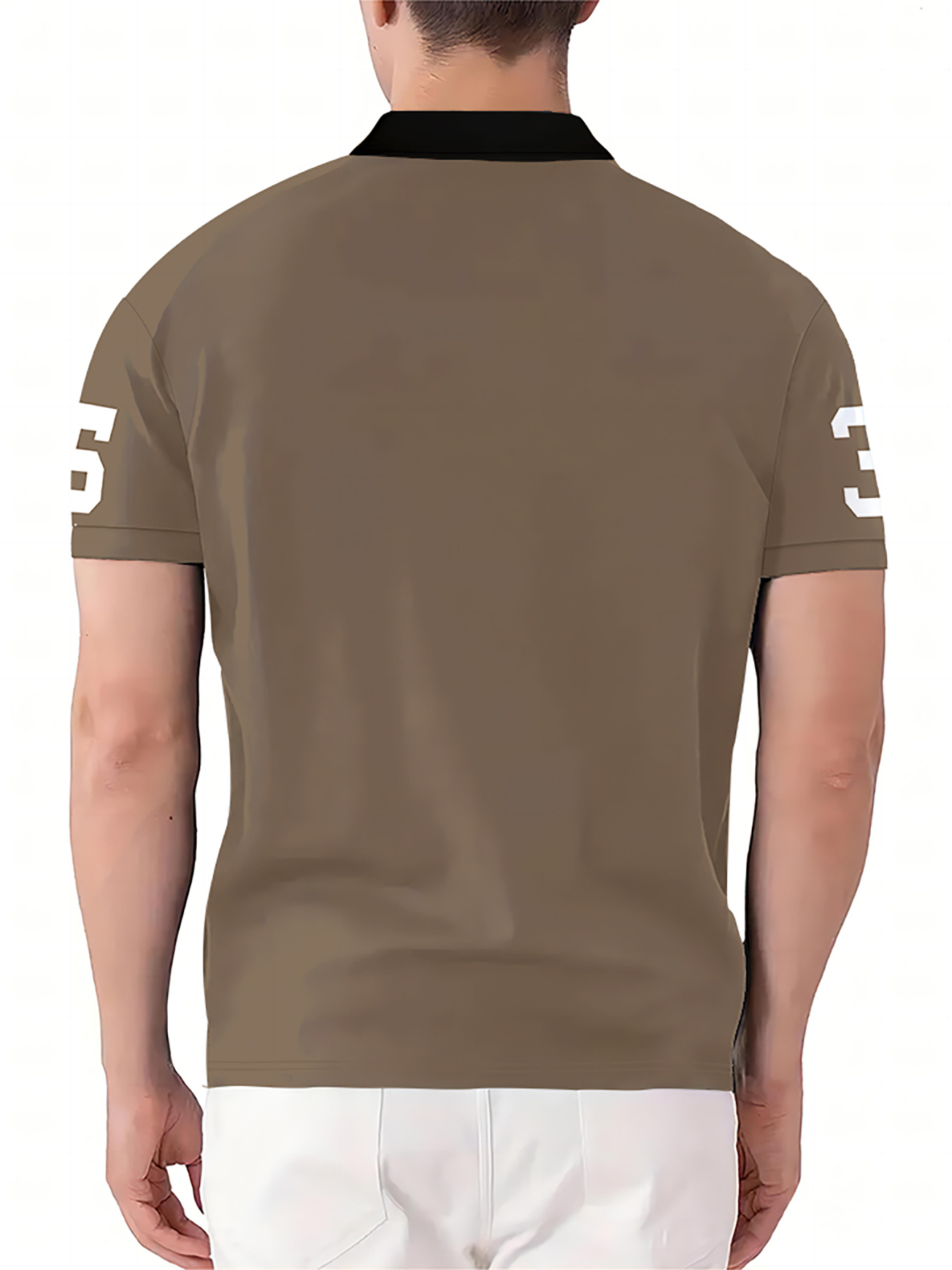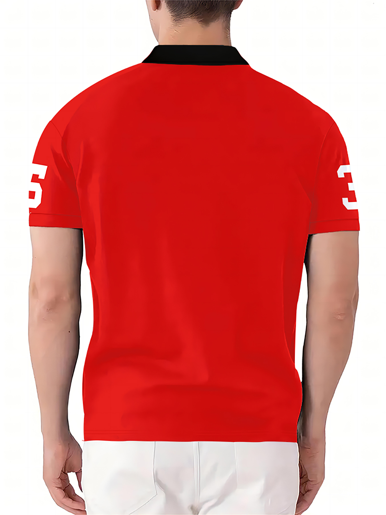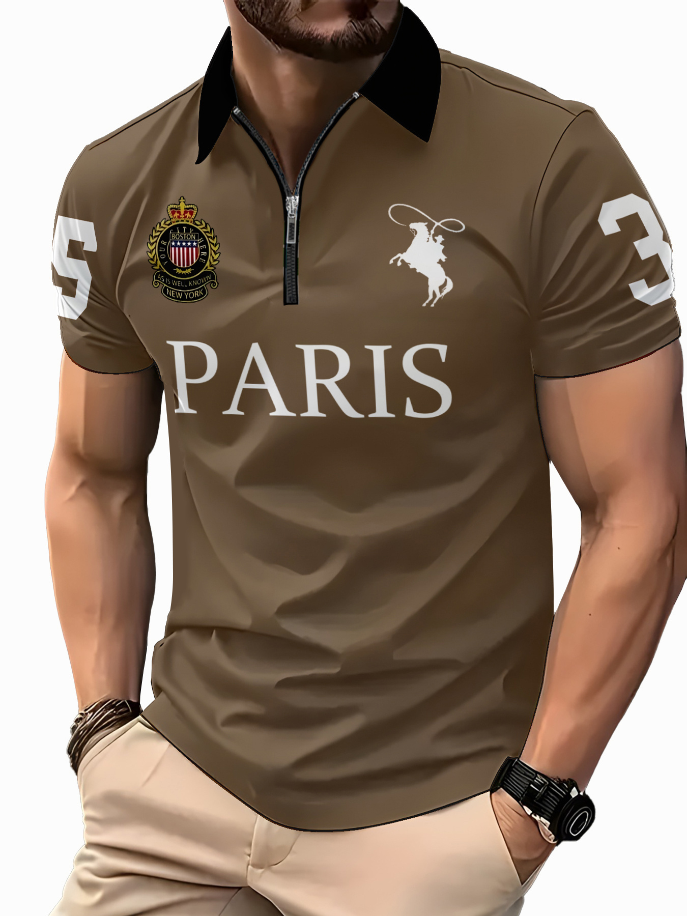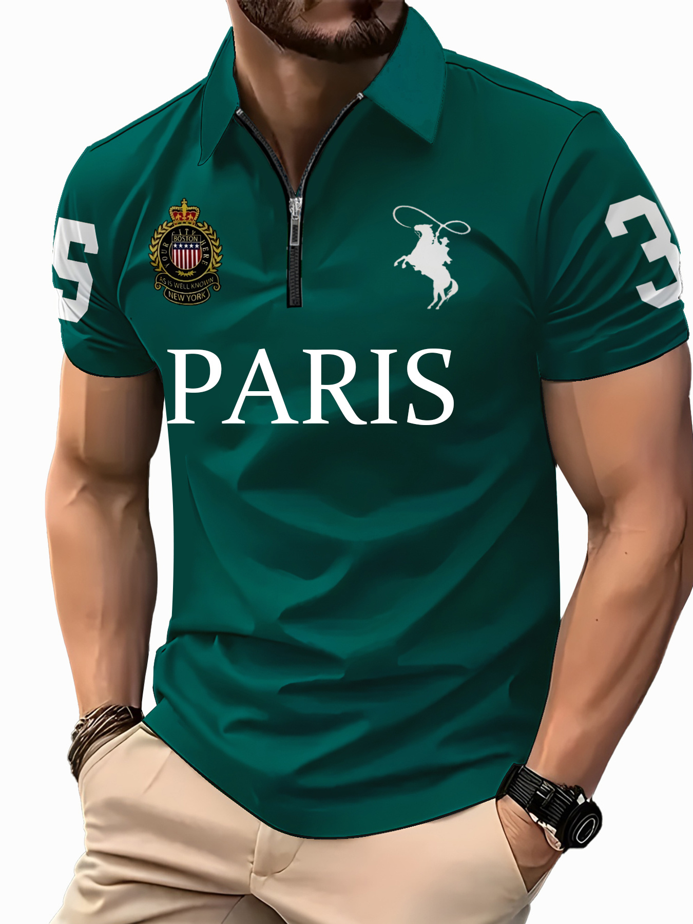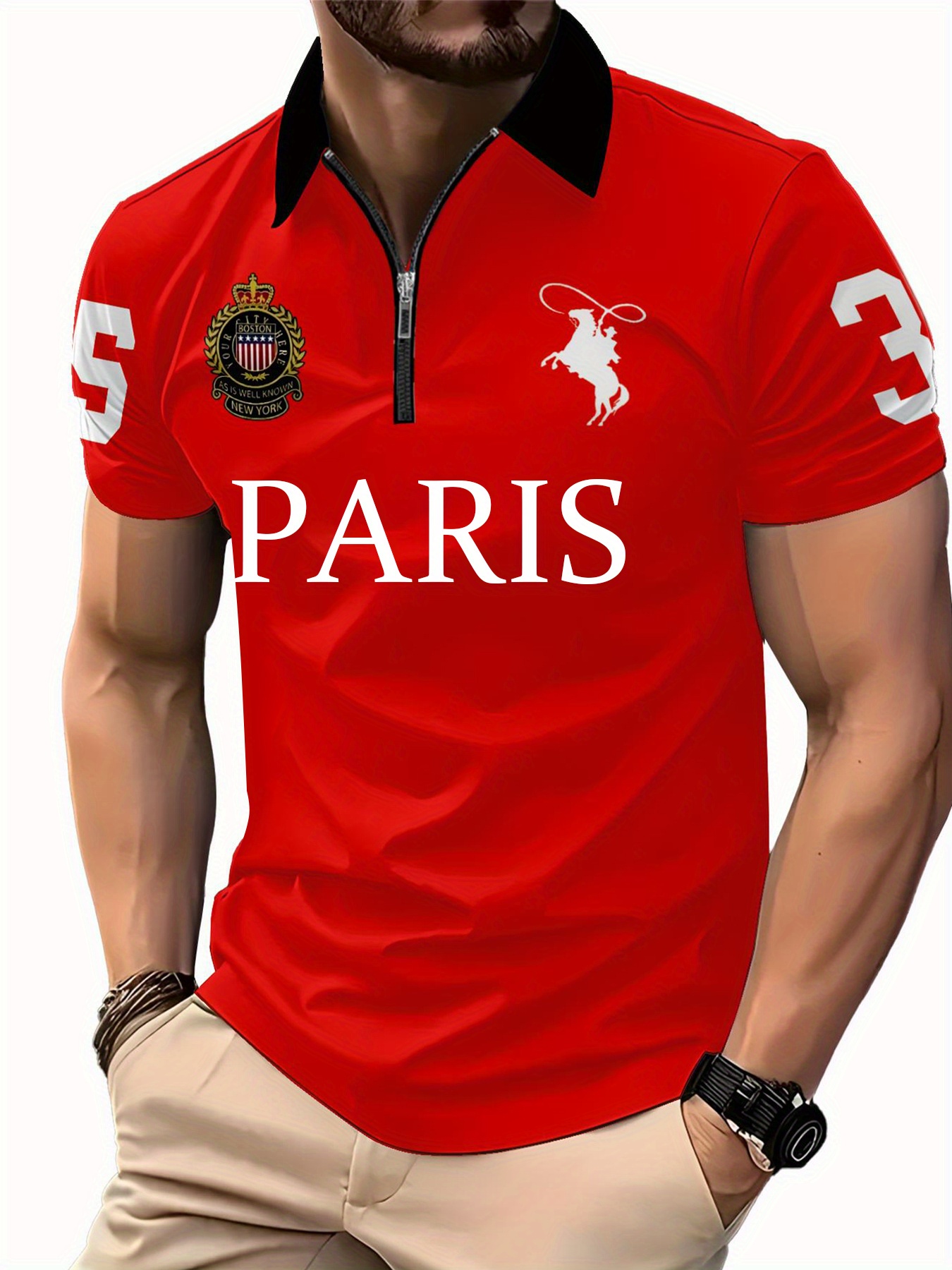 Camisa Vermelha Masculina com Estampa de Paris Elegante – Respirável 100% Poliéster, Manga Curta, Detalhe com Zíper, Conforto para Golfe e Uso Casual, Roupas de Golfe