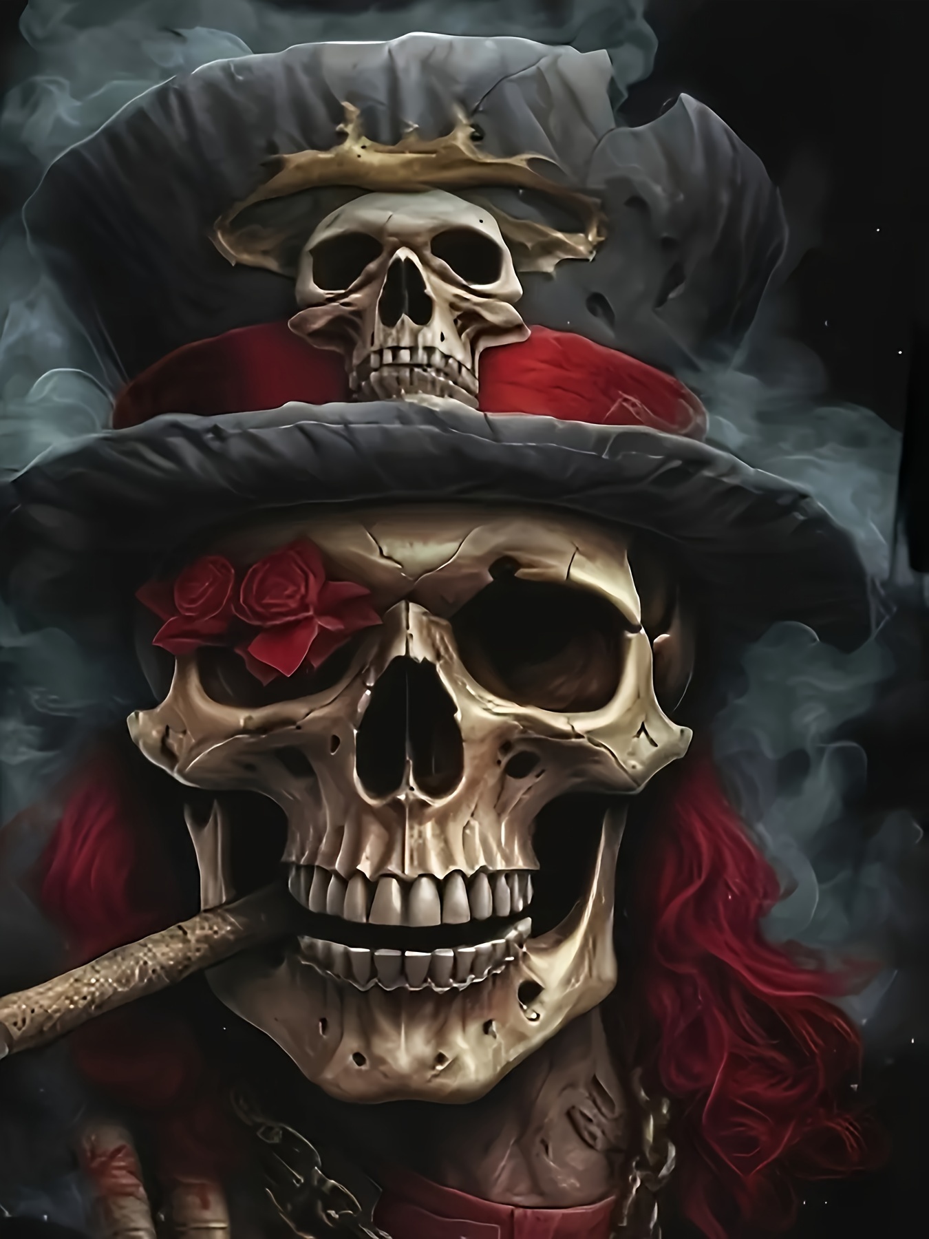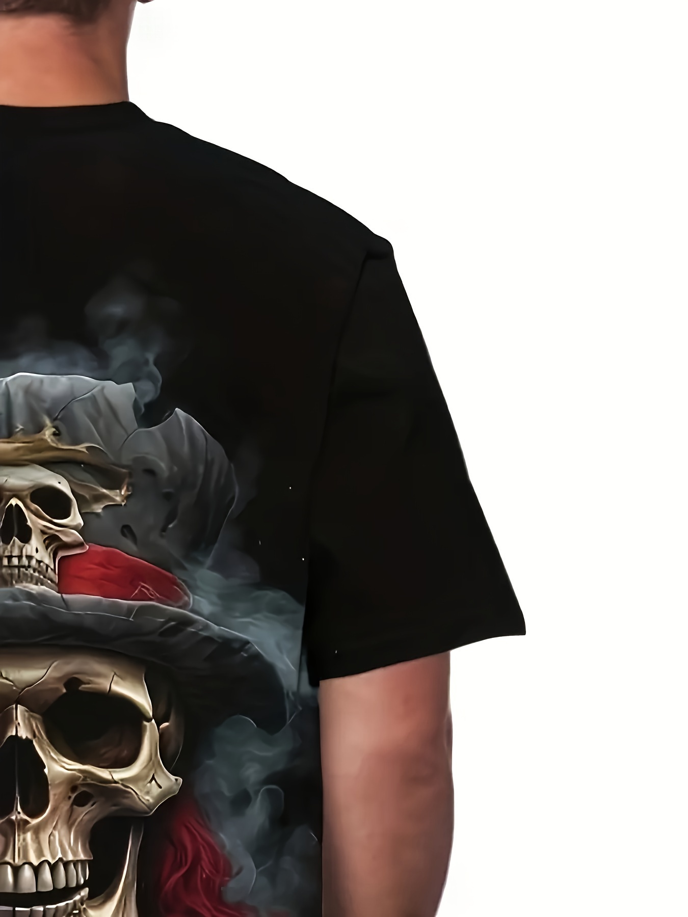 Camiseta gráfica de pirata com crânio 3D para homem – Preto casual com decote redondo e mangas curtas com design de rosas vermelhas e cigarro, perfeita para festas punk e uso diário, camiseta de uso diário | Camiseta com estampa de crânio | Camisa de tecido de malha
