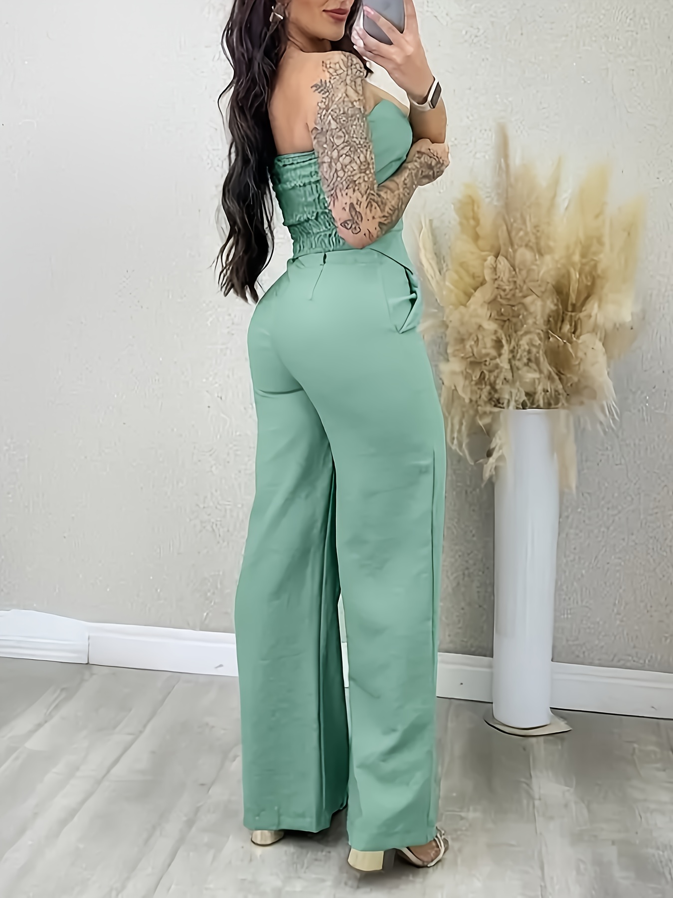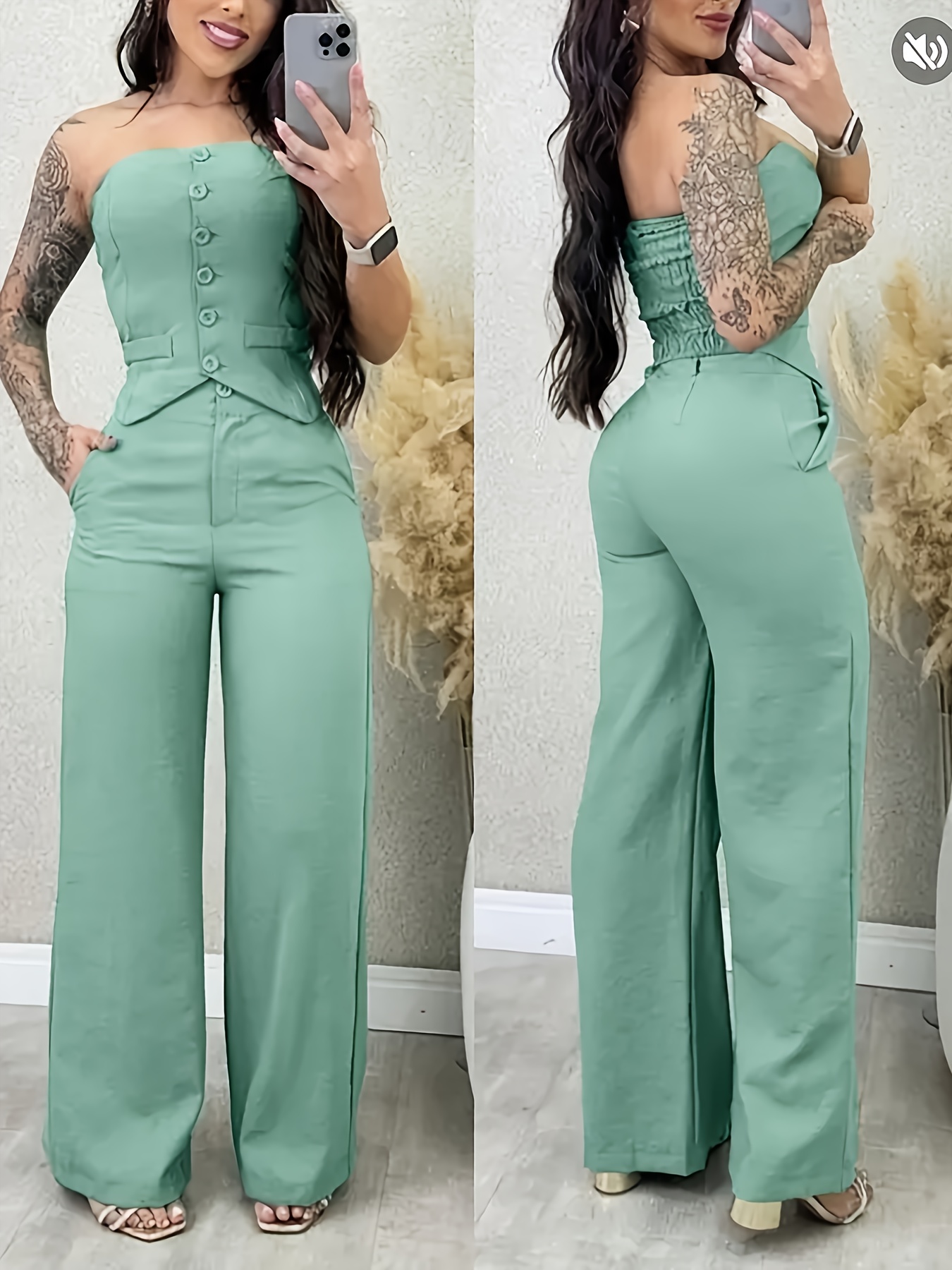 Conjunto de calças largas de ombro descoberto, estilo moderno, adequado para trabalho e uso casual.