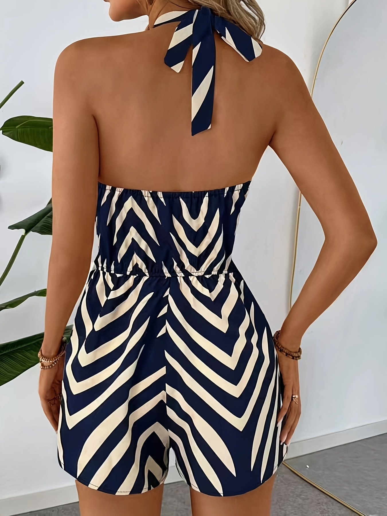 Macacão Feminino de Cintura Alta Elástica com Listras – Azul Marinho & Estampa Zigzag, Gola Halter com Laço Frontal, Lavável à Máquina para Férias na Praia e Passeios Casuais, Shorts de Praia em Tecido Elástico