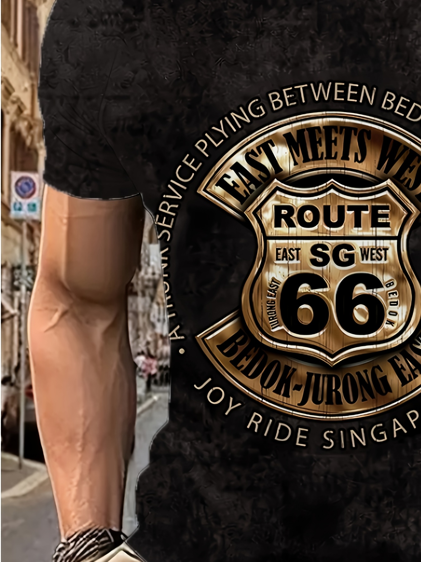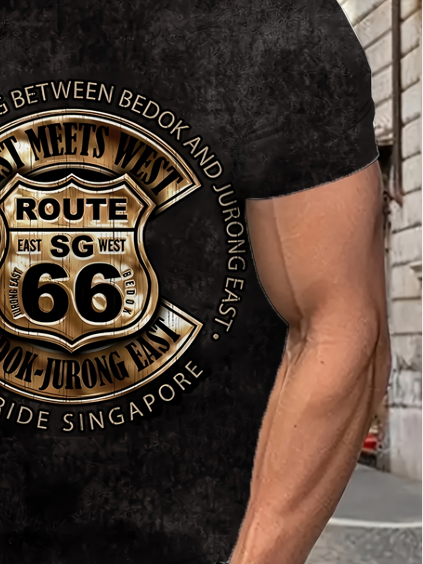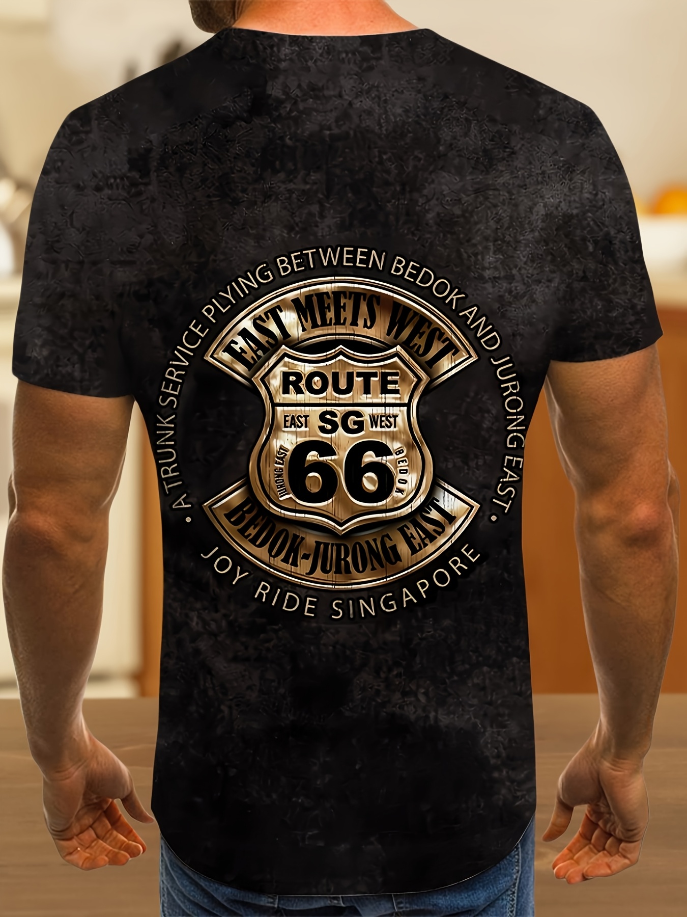 T-shirt gráfica retro Route 66 para homem – T-shirt casual preta de manga curta com letras douradas, roupa de rua para exterior de verão, decote redondo, ajuste regular, moda de rua | Camisa estilo vintage | Tecido durável